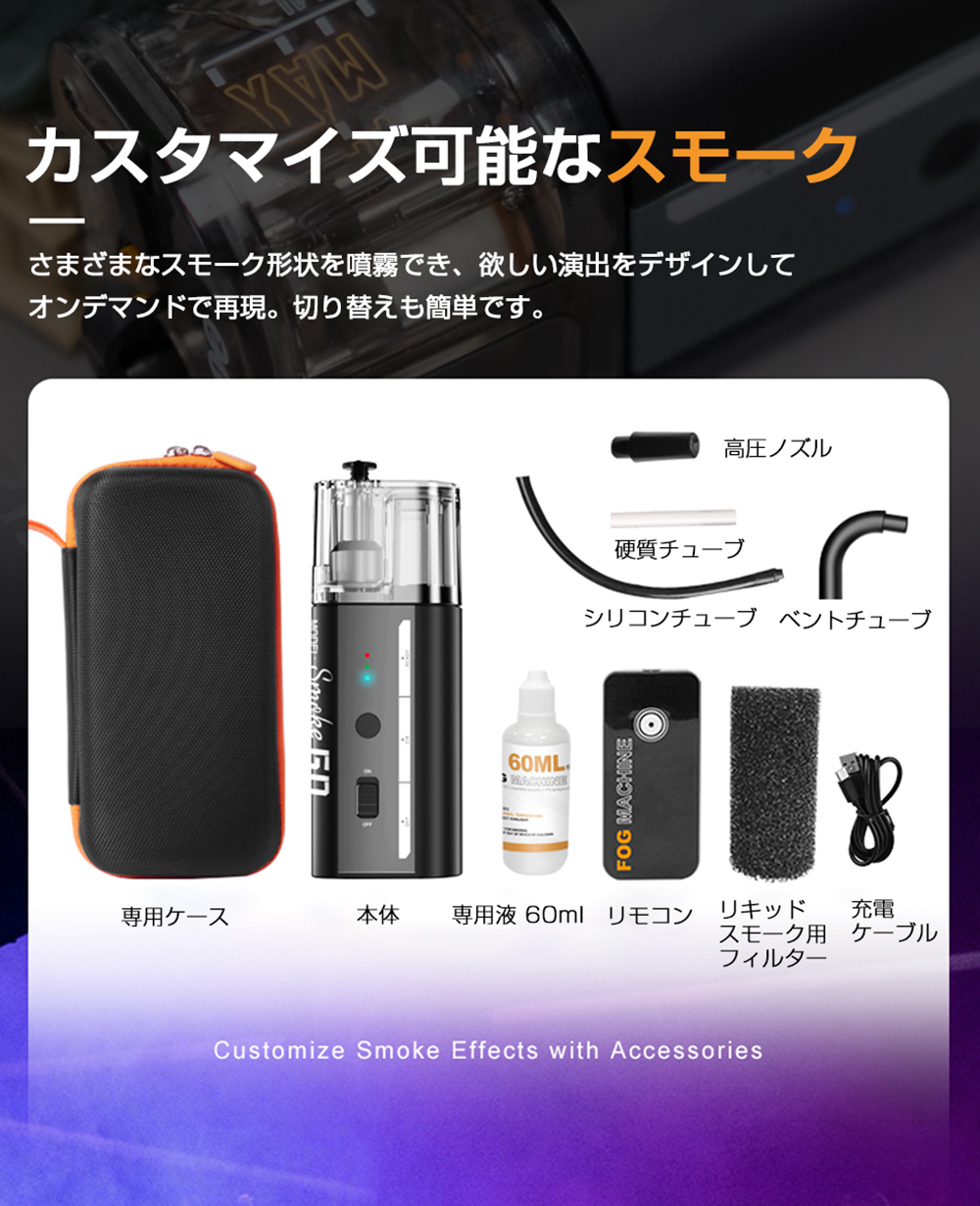 スモークフルードを入れて電源を入れるだけで、魔法のような演出がスタート。プロはもちろん、初心者でも直感的に扱えます。
