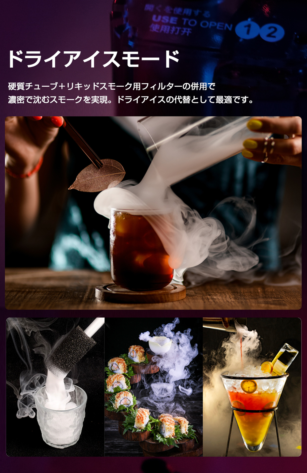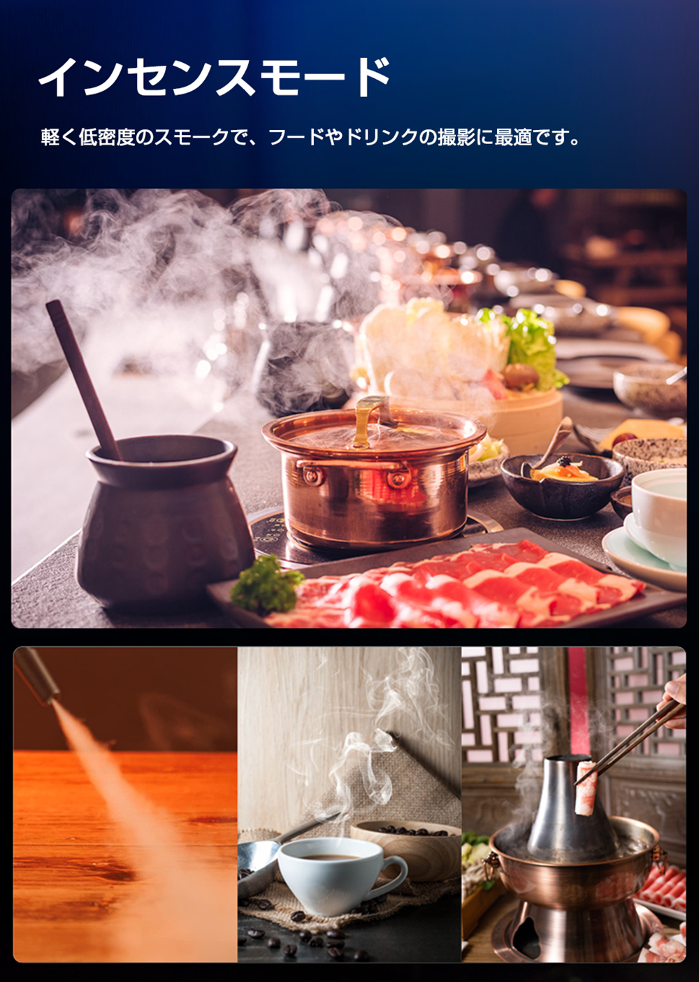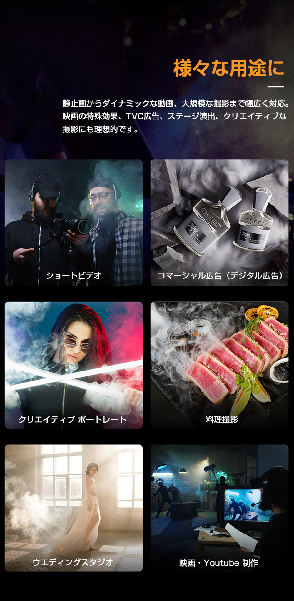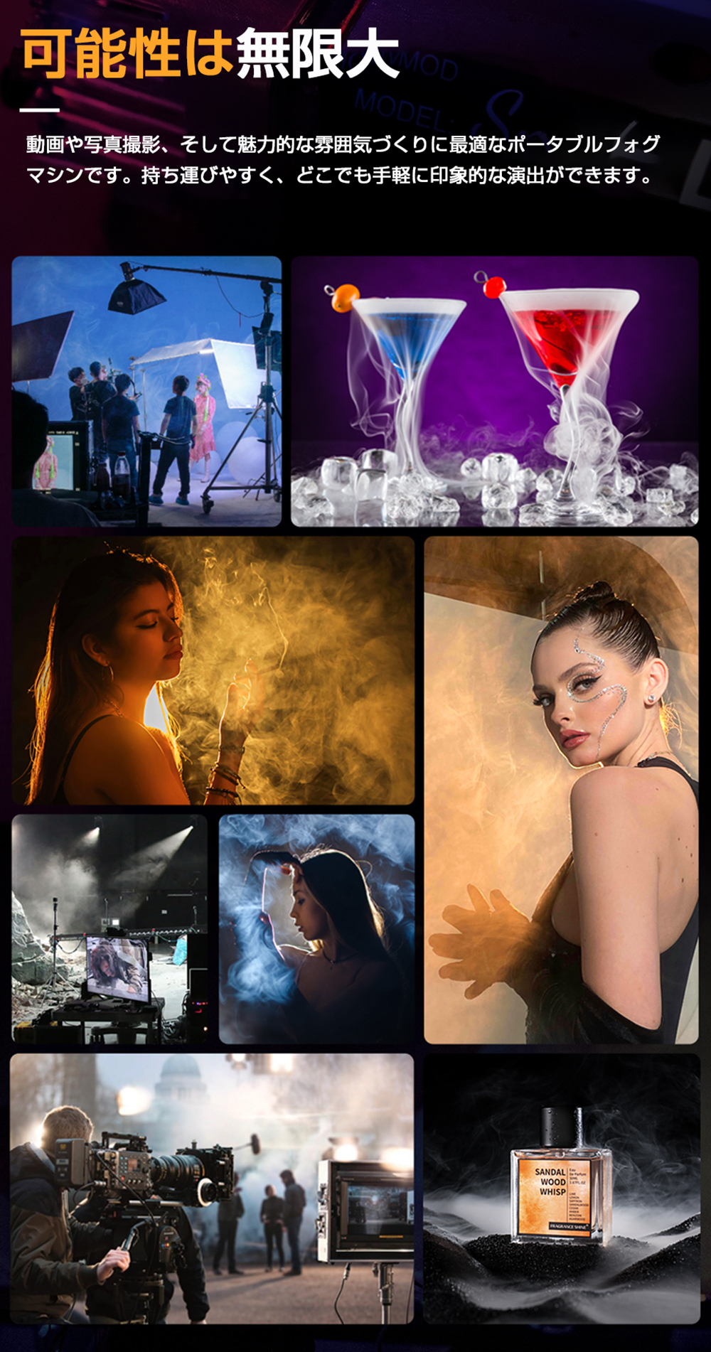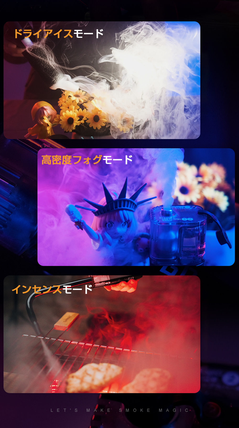 ポートレートモード、ドライアイス風エフェクト、シネマティックミスト、インセンスモード、マニュアル操作など、多彩なモードを搭載。コンサートのドラマチックな演出、結婚式の幻想的な雰囲気づくり、ハロウィンのスプーキーな演出まで幅広く活躍します。