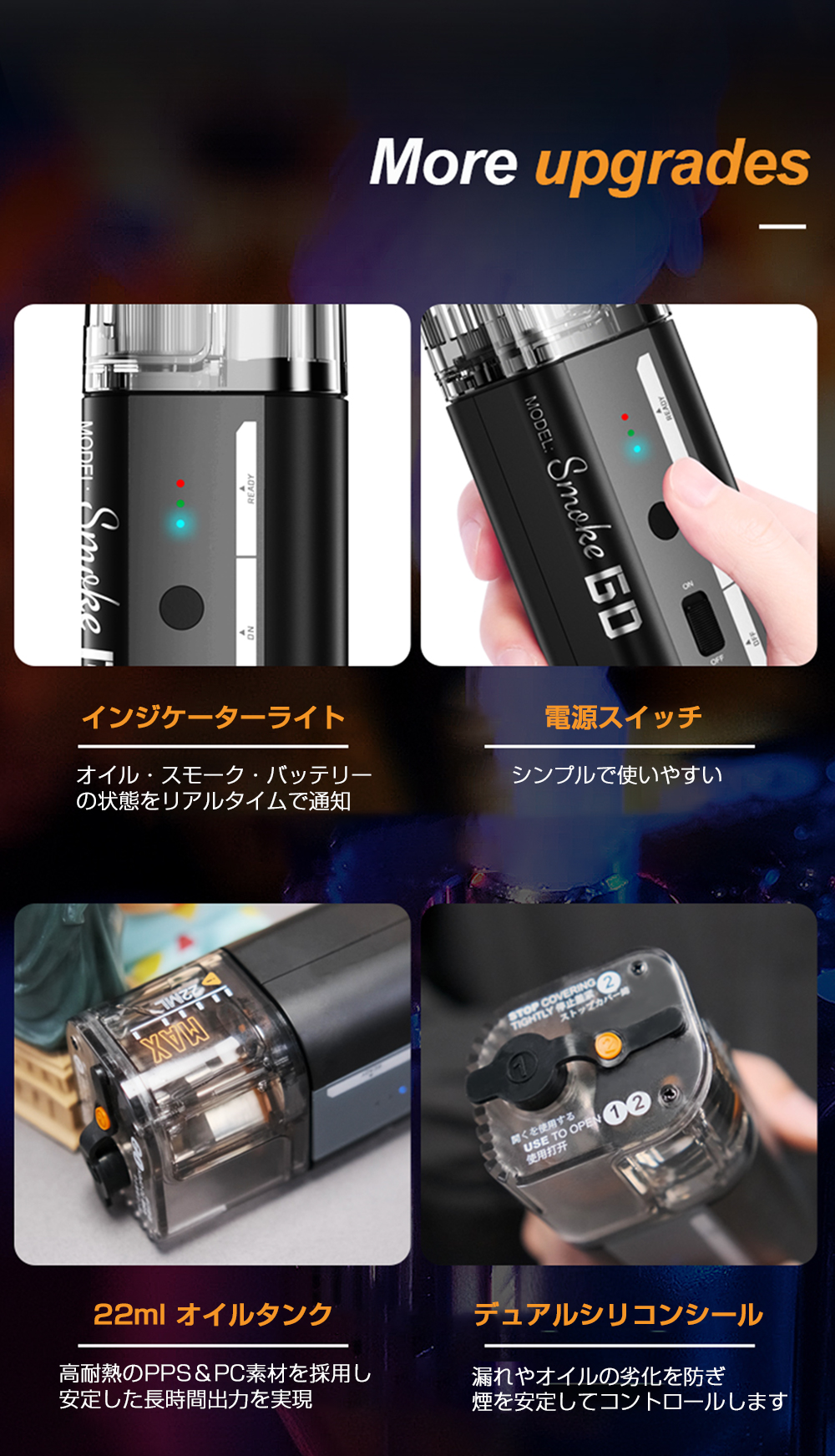 LENSGO Smoke GO は60mlフルードに対応し、CE/RoHS/SDS/MSDS 認証を取得。漏れ防止設計と、クリーンで無毒・環境配慮型のスモークフルードで、人や衣類にも安心です。