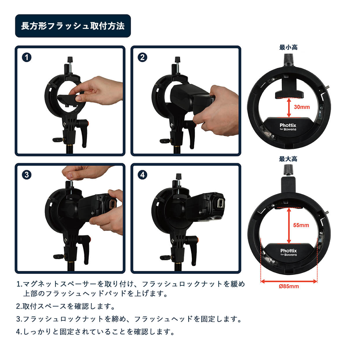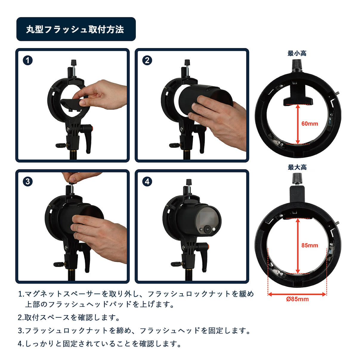 マグネットスペーサーを標準装備し、長方形ヘッド・丸型ヘッドなど様々な形状のフラッシュに対応。セットアップの自由度が向上します。