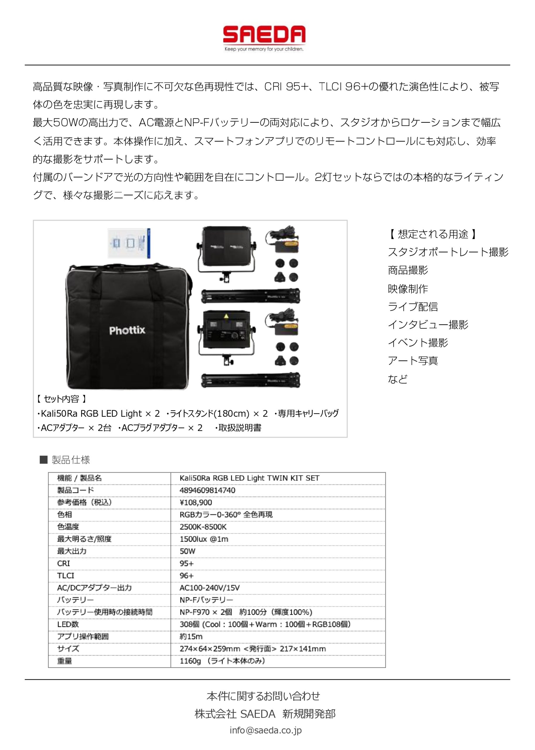2025.09.29お知らせ プレスリリース ブランド <Phottix>「Kali50Ra RGB LED Light Twin Kit Set」を発売 Kali50Ra RGB LED Light Twin Kit Set 〔詳細はこちら〕 お知らせ一覧に戻る
